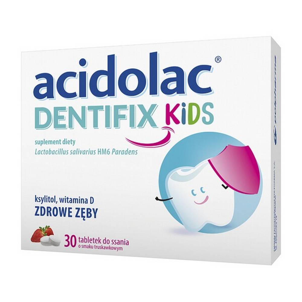 Acidolac Dentifix Kids – suplement diety zawierający składniki wspomagające zdrowe zęby. Produkt przeznaczony dla dzieci powyżej 3 roku życia.smak truskawkowy.Ksylitol wspomaga zachowanie mineralizacji zębów poprzez zmniejszenie ich demineralizacji.Witamina D wspiera utrzymanie zdrowych zębów i prawidłowego wchłaniania wapnia i fosforu.Nie należy przekraczać zalecanej porcji do spożycia w ciągu dnia.