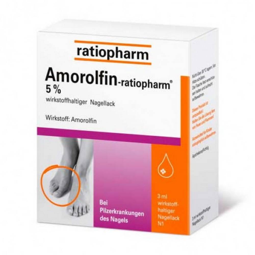 Amorolfin-ratiopharm 5 % wirkstoffhaltiger Nagellack wird bei der Behandlung von Pilzinfektionen eingesetzt und tötet eine Vielzahl von Pilzen, die Nagelinfektionen hervorrufen können. In vier einfachen Schritten behandeln Sie die betroffenen Nägel über einen Zeitraum von ca. 6 Monate (Fingernägel) bzw. 9-12 Monate