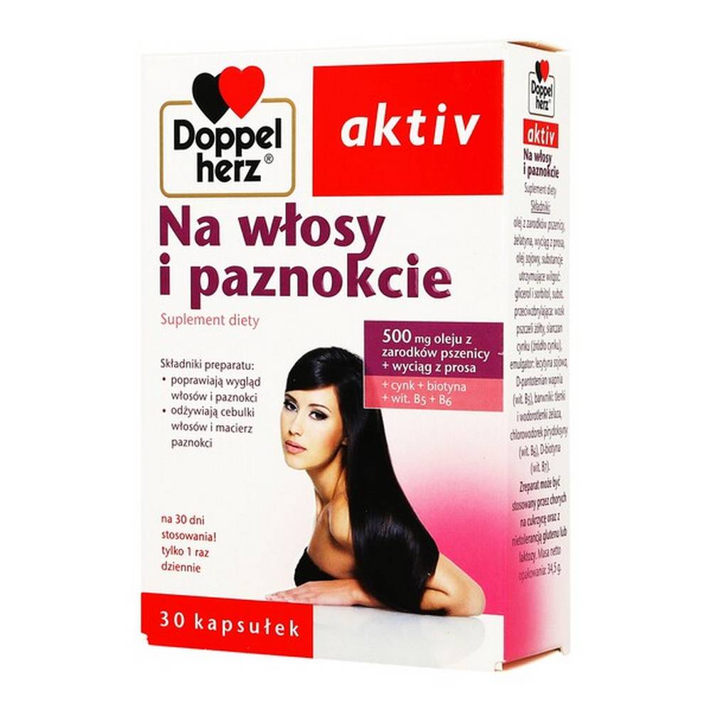 Doppelherz aktiv Na włosy i paznokcie – suplement diety, zawierający składniki, które wzmacniają strukturę włosów i paznokci, poprawiają odżywienie cebulek włosa, macierzy paznokci. Produkt dla dorosłych, szczególnie dla osób, które chcą wzmocnić włosy i paznokcie.Składniki produktu Doppelherz aktiv Na włosy i paznokcie wspomagają osłabione włosy (farbowanie, ondulacja, przesuszone).