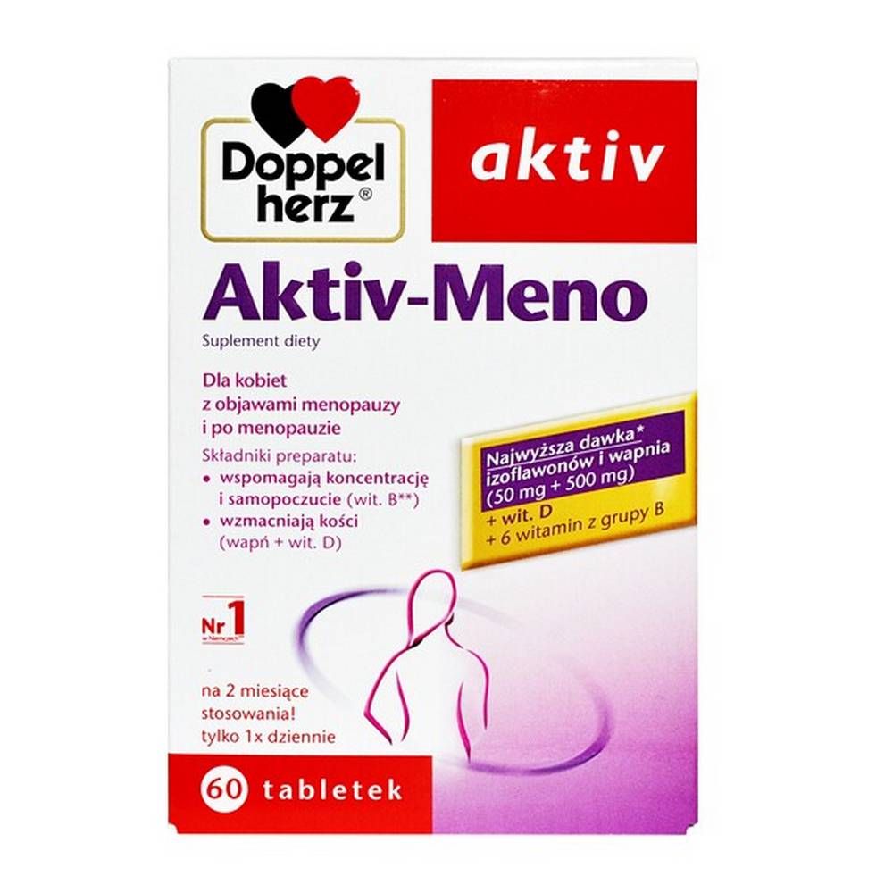 Doppelherz aktiv Aktiv – suplement diety, zawierający unikalną kombinacje 13 aktywnych składników, z najwyższą łączną dawką izoflawonów sojowych i wyciągu z szyszek chmielu.