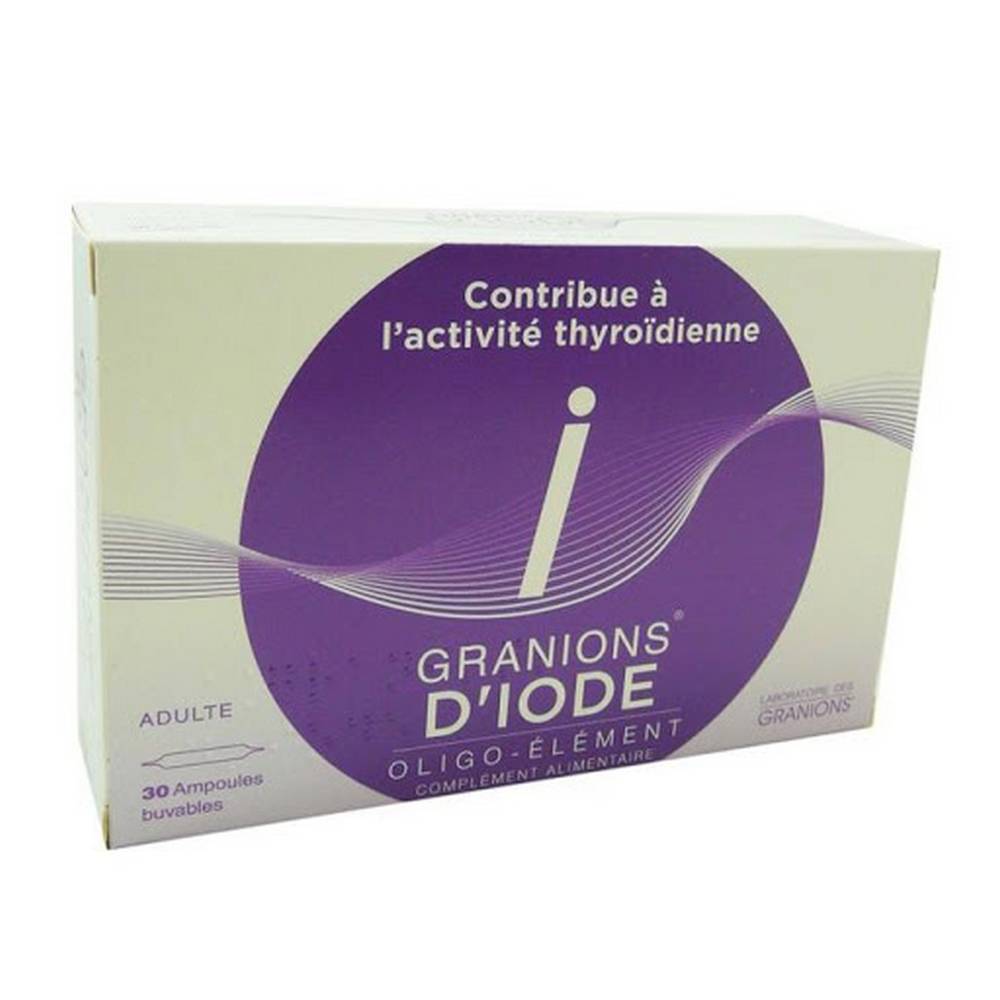 Granions d’iode est un complement alimentaire sous forme d’ampoules buvables a base d’Iode, oligo-element essentiel, indispensable a la biosynthese des hormones thyroidiennes : T4 et T3, sa forme active. Les hormones thyroidiennes sont impliquees de facon privilegiee dans divers processus fondamentaux : metabolisme cellulaire, balance energetique (dont calorigenese et thermoregulation), metabolisme des glucides, des lipides, synthese proteique et enzymatique.
