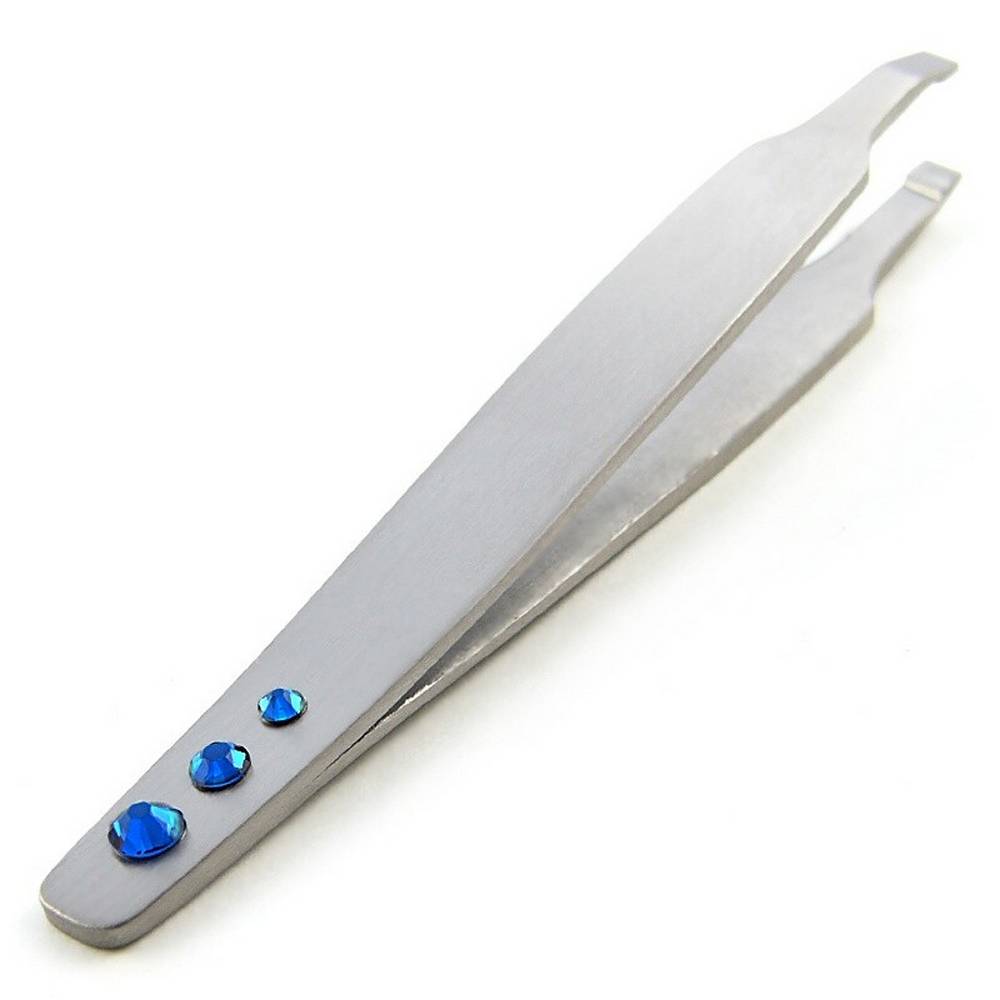 Tweezers Mini Blue with beveled tip. Ideal for use in your pocket or purse. Stainless steel and genuine Swarovski.