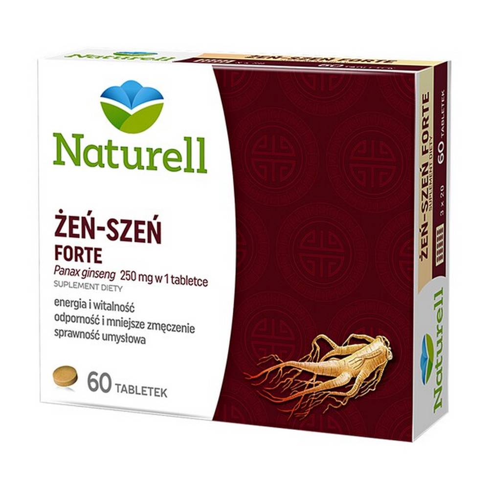 Naturell Żeń–szeń forte – suplement diety wspierający siły witalne organizmu. Produkt przeznaczony dla osób dorosłych.Wyciąg z korzenia białego żeń-szenia wspomaga utrzymanie energii i witalności, wspomaga prawidłowe funkcjonowanie układu odpornościowego, wspomaga sprawność umysłową na prawidłowym poziomie, wpływa na zmniejszenie uczucia zmęczenia i znużenia.