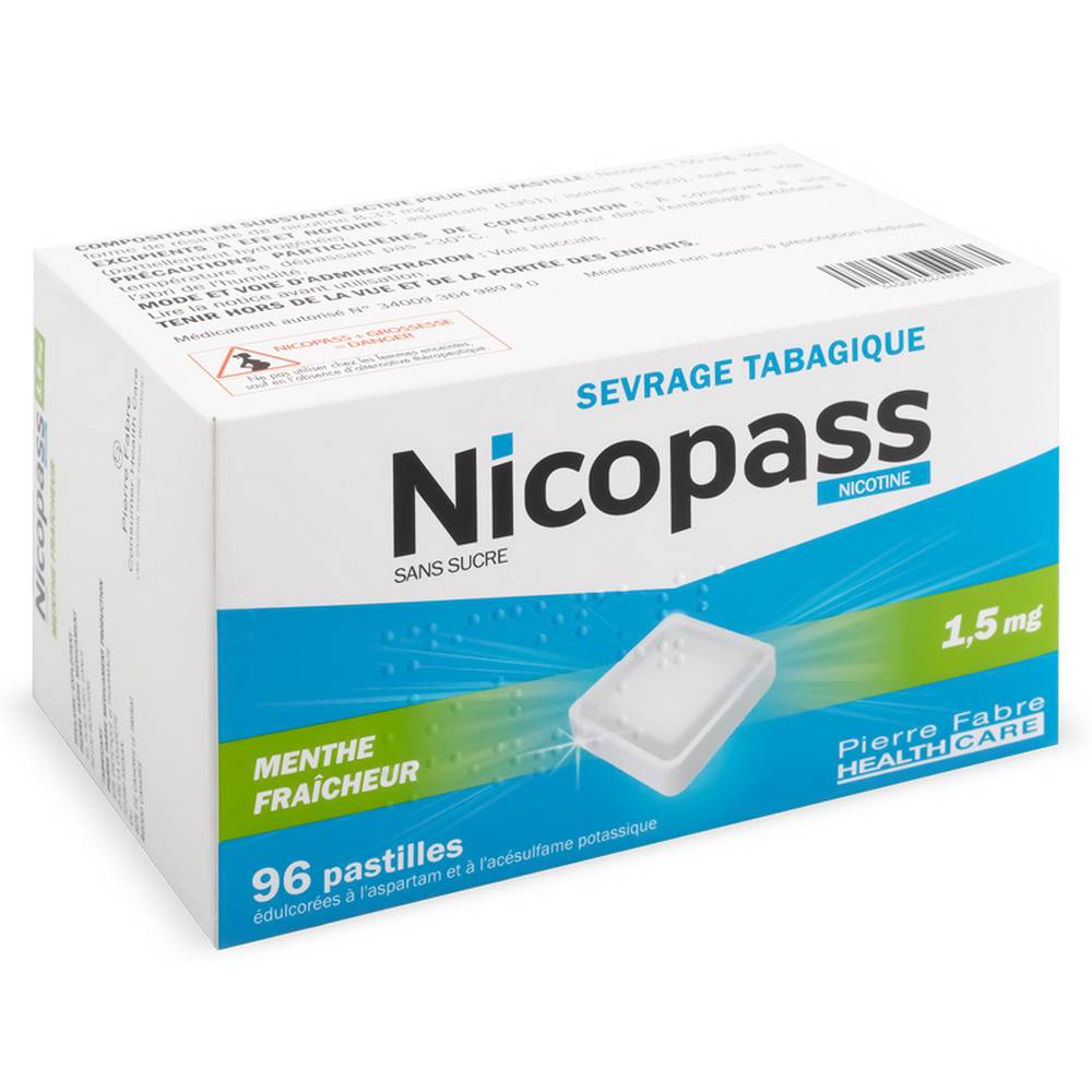 NICOPASS 1.5MG nicotine 96 PASTILLES, fresh mint taste without sugar, is recommended in smoking cessation to help moderately or weakly dependent tobacco smokers to stop smoking cigarettes.