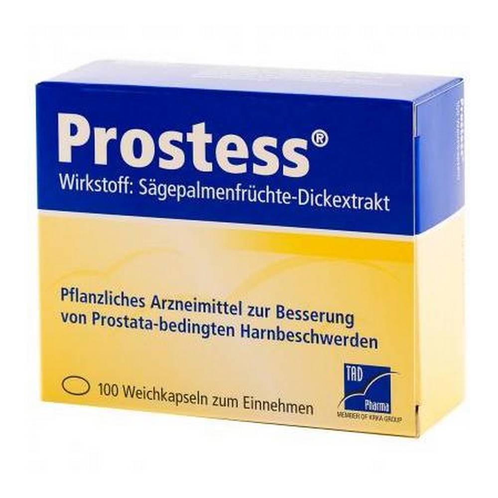 Prostess. Wirkstoff: Sagepalmenfrucht-Weichextrakt. Anwendungsbereiche: Bei Beschwerden des Wassers bei gutartiger Prostatavergro?erung (Miktionsprobleme bei gutartiger Prostatahyperplasie Stadium I und II nach Alken oder II bis III nach Vahlensieck).