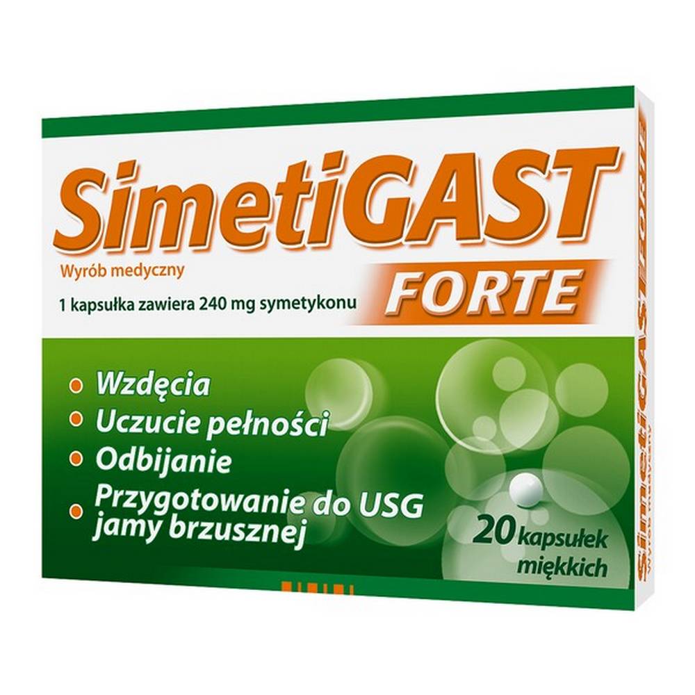 Simetigast 40 mg to wyrób medyczny, który pozwala złagodzić objawy związane z nadmiernym gromadzeniem się gazów w przewodzie pokarmowym. Może być także stosowany do usuwania nadmiaru gazów przed badaniami diagnostycznymi w obrębie jamy brzusznej: USG, endoskopią, badaniami radiologicznymi.