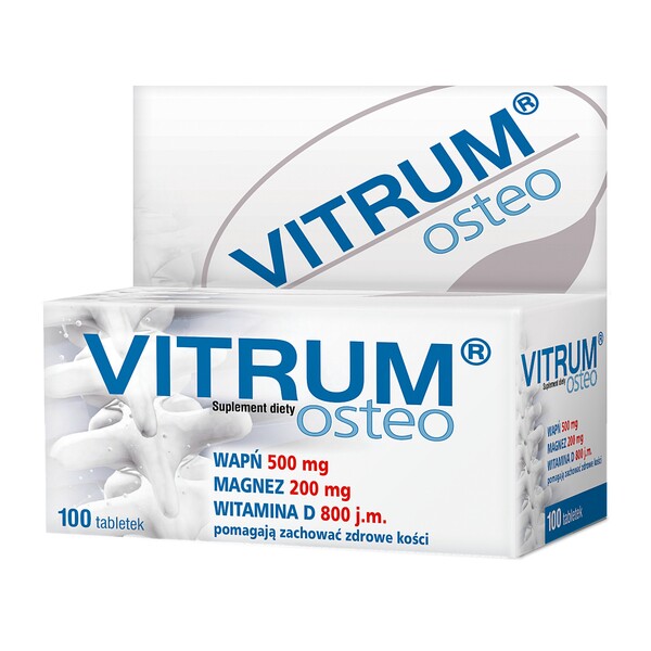 Suplement diety zawierający wapń z muszli ostryg morskich, witaminę D3 i magnez.Vitrum Osteo zawiera wapń pozyskiwany jest z muszli ostryg morskich.Wapń potrzebny jest do utrzymania zdrowych kości. Witamina D3 polepsza wchłanianie i wykorzystanie wapnia. Ponadto witamina D3 jest odpowiedzialna za utrzymanie prawidłowej siły mięśniowej – co redukuje ryzyko upadków i w konsekwencji – złamań. Wraz z witaminą D3 i magnezem, wapń jest odpowiedzialny za właściwy proces mineralizacji kości.Przeznaczony dla osób dorosłych w celu uzupełnienia diety w wapń i witaminę D3.